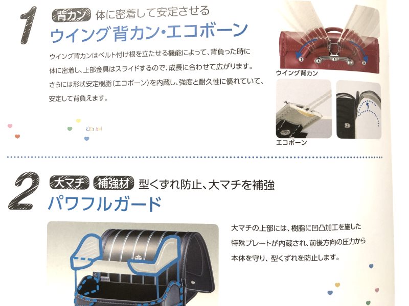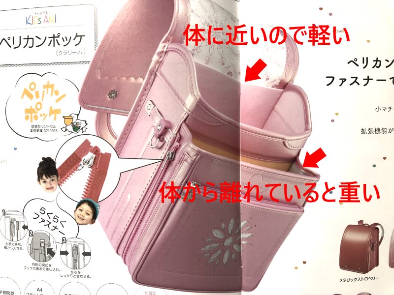 キッズアミの評価や口コミ 22,990 views ナースのランドセル 7.6 背負いやすさの工夫 8.0/10 扱いやすさの工夫 8.5/10 品質や作り 7.5/10 商品と価格のバランス 7.0/10 kazumamaの好み 7.0/10 良い点 技術力が高いメーカー 機能が豊富 軽い バリエーションが豊富 悪い点 機能がバラバラで煩雑 ホームページが情報不足 デザインが全体的にシンプル 大手なのにマイナー気味 kazumamaの採点表(独断と偏見) ナース鞄工が作るキッズアミ 昨年はカタログ請求をしたらPDFかなんかを普通にプリントし、ホチキス留めしただけのもので届いたため、評価に値しませんでしたが、今年はちゃんとしているので評価記事を書きます。 今年のキッズアミのポイントとしては メイン収納部の広さを色々選べる という部分です。 キッズアミを作っているのはナース鞄工という老舗メーカーですので、その点を踏まえて機能や品質面についてkazumama的な評価をしていきます。 10.5cm~13.5cmの大容量までラインナップさらに、小マチが広がるペリカンポッケも登場 ナースは工房ではなく量産系ですので、機能に関しては抜群です。 中でも ・背あてクッション(ウインディ ソフト) ・ウイング背カンエコボーン ・パワフルガード の3つはとても優れています。 また、最近A4フラットファイル対応が普通になって横幅が大型化しましたが、さらに大マチ部の厚みも大型化の流れがあります。 キッズアミの場合、主流の12cmからさらに大きい13.5cmやファスナー式で幅を伸縮できるペリカンポッケがあります。 ペリカンポッケは小マチが伸縮しますが、ドリームキューブは大マチが伸縮するタイプです。 ※大マチ伸縮と小マチ伸縮では若干というか、全く異なるので、両者を同じように考えるのは危険です。 ドリームキューブの場合、大マチが最大15cmまで拡大します。 前にイオンで販売していたフレックスワイドと同じような感じです。 15cmはかなり大きくて一見魅力的ですが、 大マチ伸縮は結構使いづらいので、あまりオススメはしません。 まずはペリカンポッケやドリームキューブの注意点を解説していきます。 クセが強いファスナー伸縮の注意点 ペリカンポッケの注意点 アップ式背カンや天使のはねなど、体感重量を軽くするための機能は年々良くなっています。 しかし、そもそも背中から最も遠い位置を拡大するということは、その部分の重量が増す使い方をするということです。 体から遠い位置にある小マチに重たいものを入れると、体感重量はかなり重く感じます。 その為、便利な機能ですがペリカンポッケで拡大させた部分に入れるものは、軽いものでないと負担が増してしまいます。 ドリームキューブの注意点 もう画像のままです。 最も中身の入れ替わりの激しいメイン収納部にフタのようなものがあると ものすごい邪魔です。 イオンのフレックスワイドでもそうでしたが、この商品も同じく利便性が損なわれます。 背負いやすさに影響する大事な機能 背負いやすさは背カンや肩ベルト形状が重要ですが、それ以外にも重要な部分があります。 それが「背あて」です。 背あては通気性ばかり目が行きがちですが、クッション性や形状も重要です。 キッズアミの場合「ウインディソフト」という背あてを使用しています。 最近のランドセルは厚みが増す分背あてかかる体圧にも注目しなければなりません。 キッズアミの場合、しっかり専門機関で体圧分散測定試験を行っているので、とても優れた背あてですね。 ウイング背カン エコボーンパワフルガード エコボーンはイオンでも売りにしていますが、キッズアミの場合、肩ベルト内の樹脂は ・強度 ・耐久性 を謳っています。 実際アップ式の場合、肩ベルトは結構グデっと垂れ下がった状態で折れるので、内部に形状安定樹脂が入っているのはメリットが大いにあります。 また、パワフルガードについては最も強度を必要とするメイン収納部の開口部分の補強なので、効果絶大です。 強度面に関してはさすが技術力のある量産メーカーですので、安心して6年間使用できますね。 キッズアミのまとめ 技術力もあり、多くのメーカーのOEMをこなす大手ランドセル工場のナース鞄工。 その自社ブランドであるキッズアミは、十分に機能や品質を兼ねそろえたランドセルです。 ただし、大マチサイズが色々あり、ラインナップが煩雑ですので、選ぶのはとても大変そうです。 ペリカンポッケやドリームキューブといったクセの強いランドセルもあります。 実際に背負ってみることは当然ですが、使用するイメージをしっかり考えてサイズを選ばないとダメです。 ただ大きければ良いというものではありません。 また、牛革モデルやコードバンモデルはA4フラットファイルに対応していません。 そういった点を注意しつつ、カタログを熟読し、ラン活しましょう。 ※なぜかWEBでは全然情報が掲載されていませんので、カタログ請求は必須です。 キッズアミの公式ホームページはこちら http://www.naas.co.jp/ その他のメ